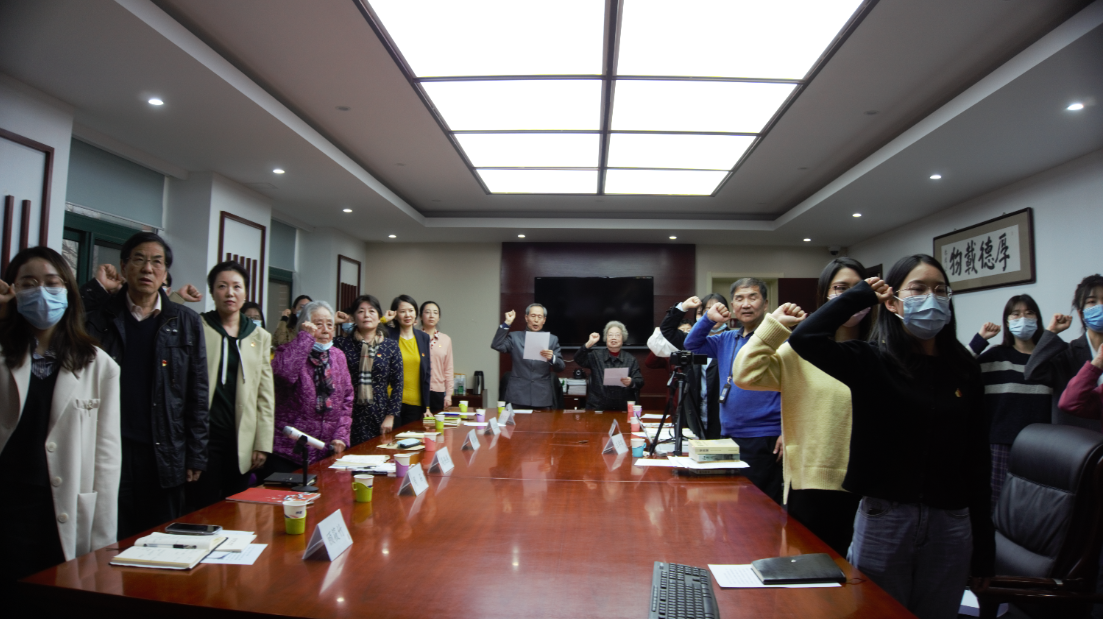 老中青三代党员面向党旗,在离退休第三党支部书记赵永奎领誓下,全体党员庄严举起右手,重温入党誓词,对党庄严宣誓。