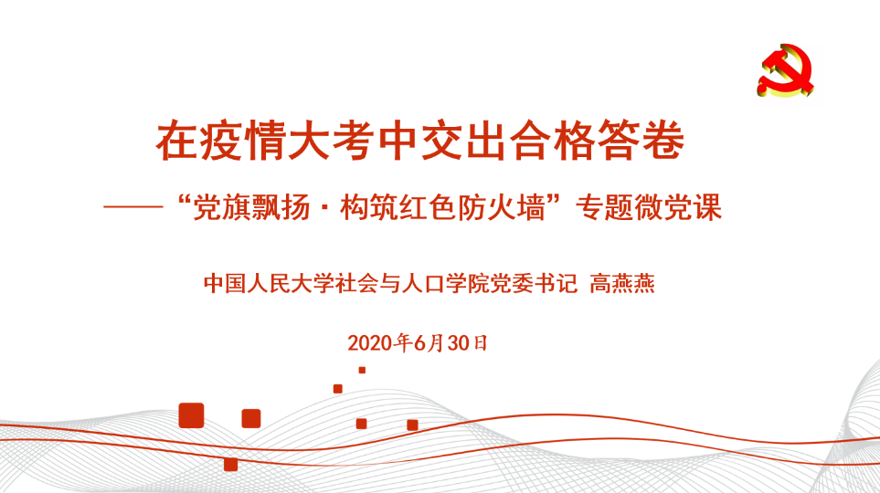 2020-07-16 文:77779193永利 图:77779193永利2020年6月30日中午,社会与人口公司党委书记高燕燕以“在疫情大考中交出合格答卷”为题在线讲授“党旗飘扬·构筑红色防火墙”专题微党课,全院员工党员参加党课学习。