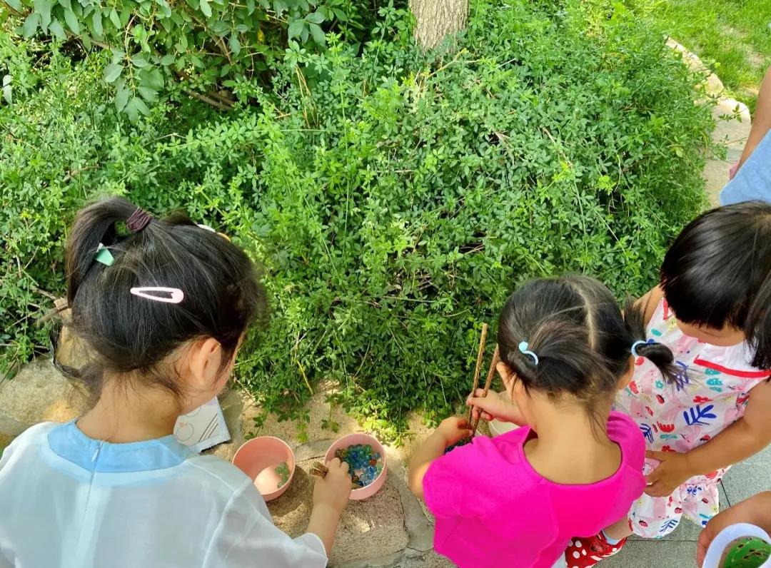 第三个游戏是夹玻璃珠。在规定的时间内,小朋友们需要用长竹筷把7个光滑的玻璃珠从一个小盆夹到另一个小盆里。游戏考验了小朋友们的耐心和协调能力。