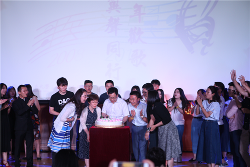 随着生日快乐歌响起,工作人员缓缓推出生日蛋糕,领导嘉宾和参演人员上台唱响生日歌,一同许下下一个十年相聚的愿望。
