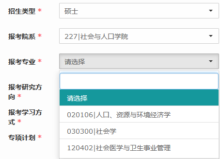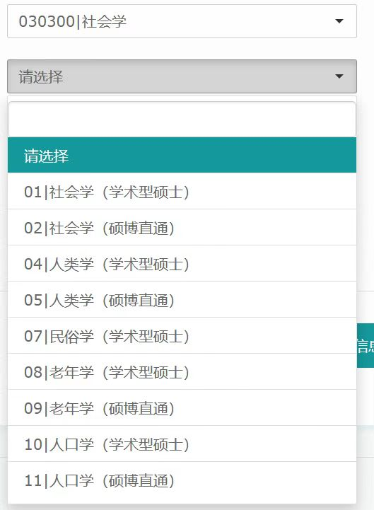 请注意:今年按照公司规定,社会学一级学科实行大类申报,社会学一级学科下的二级学科,包括社会学、人口学、人类学、老年学、民俗学等5个专业所涉及的“学术型硕士项目”和“硕博直通项目”均在报名系统的“社会学”下的“报考研究方向”中选择填报。