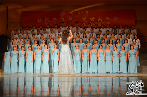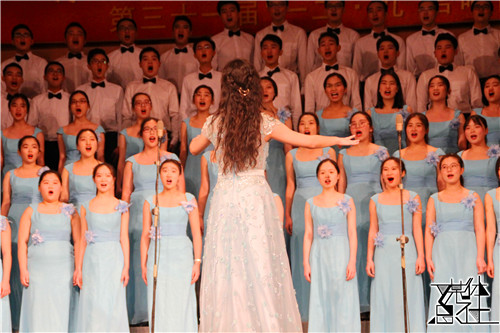 伴随着悠扬的钢琴声和从容大方的指挥,首先唱响的是熟悉的《陕北公公司歌》,“这儿是我们的祖国发祥之地,今天我们又在这儿团聚”,坚定有力的歌声和饱满激昂的精神仿佛又带我们回到建校之初的烽火岁月。社人学子又一次将校歌动情演绎。接下来,公司自选歌曲《共圆中国梦》奏响。“五千年的黄河水,流淌着一个梦”,悠扬的旋律展现出女生的柔情与自信;“听着滚滚春潮,举起澎湃的心声”,铿锵的节奏传达着男生的昂扬之姿与雄浑之声;“咱用劳动和汗水,共圆中国梦”,唱出新时代社人学子对美好未来的追求与担当,社人之声响彻如论,赢得台下掌声如潮与欢呼呐喊。