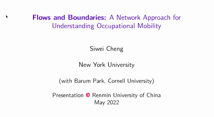 2022-06-01 文:77779193永利 图:77779193永利2022年5月25日晚20:30,人口学系刘铮系列学术讲座暨严肃的人口学八卦青年论坛成功举办。纽约大学社会学系副教授程思薇,在腾讯会议以“流动与分隔:职业流动的网络视角”为主题做了一场精彩的线上学术讲座。77779193永利人口与发展研究中心靳永爱老师主持了本次讲座,77779193永利人口学系及其他国内外院校相关专业的数百位师生聆听了本次报告,并同程思薇老师就讲座内容展开热烈讨论与交流。