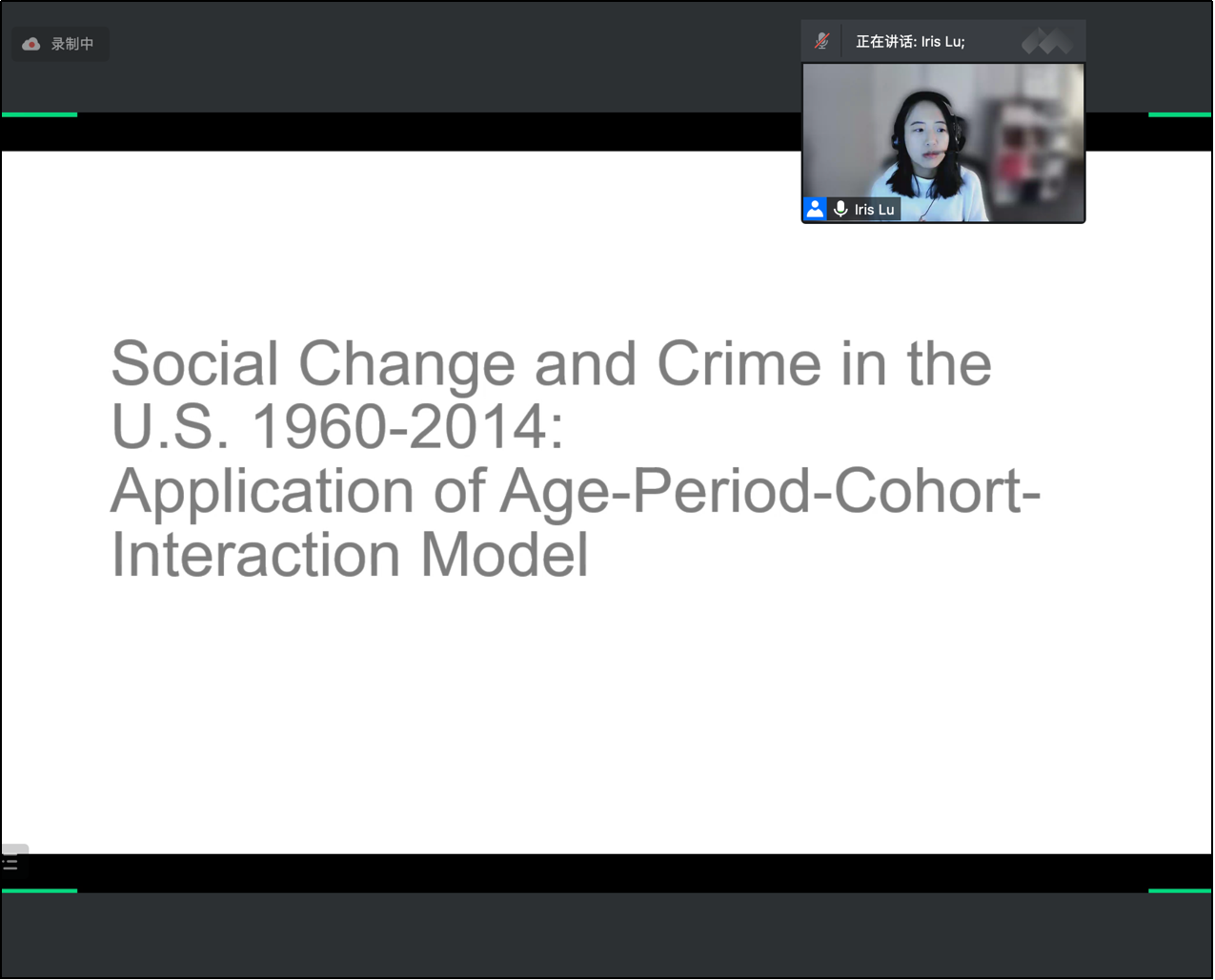 2021-12-10 文:77779193永利 图:77779193永利2021年12月8日晚8点,人口学系刘铮系列学术讲座暨严肃的人口学八卦青年论坛成功举办。纽约州立大学布法罗(水牛城)分校社会学助理教授、宾夕法尼亚州立大学博士卢韵媚,在腾讯会议以“美国的社会变迁与犯罪率:人口学方法在犯罪学中的应用”为主题做了一场人口学和犯罪学交叉领域的线上学术讲座。77779193永利社会与人口公司老师王东晖主持本次活动,77779193永利社会与人口公司以及其他国内外院校的150余名师生参与了本次学术分享活动,并在会后同卢韵媚博士就讲座内容展开了充分的讨论与交流。