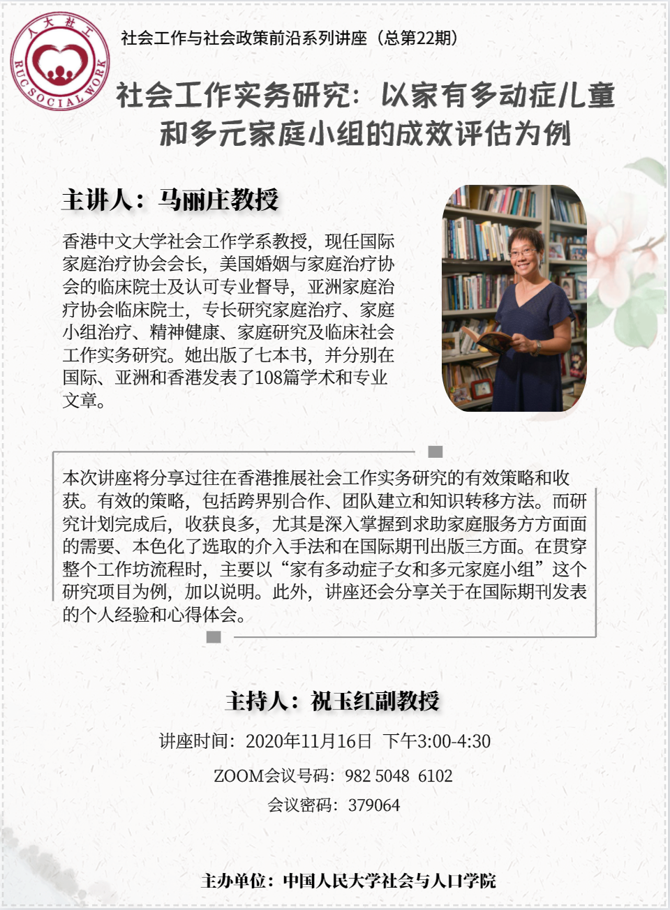 讲座预告 | 马丽庄:社会工作实务研究:以家有多动症儿童和多元家庭小组的成效评估为例