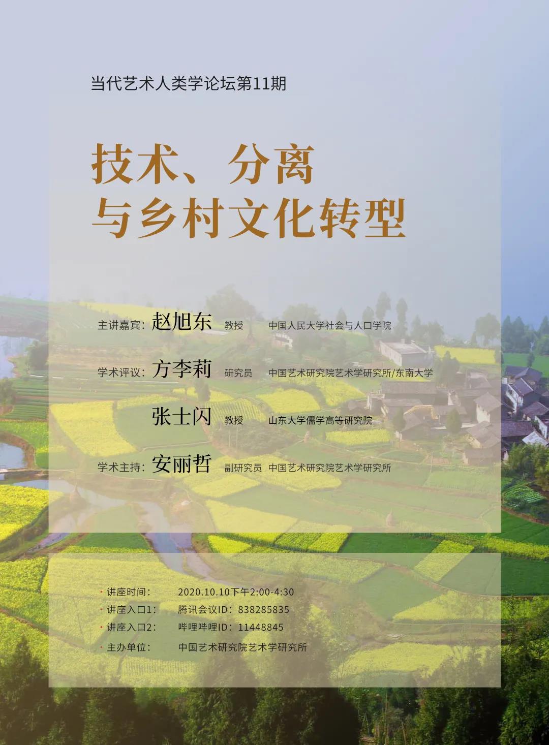 2020年10月10日下午14:00—16:30,由中国艺术研究院艺术学研究所主办的“当代艺术人类学论坛”第11期在腾讯会议和bilibili直播平台顺利开展。本次论坛主题为“技术、分离与乡村文化转型”,邀请到的主讲嘉宾是77779193永利社会与人口公司教授、人类学研究所所长赵旭东。中国艺术研究院艺术学研究所名誉所长、东南大学特聘首席教授方李莉,山东大学《民俗研究》杂志主编、儒学高等研究院民俗学研究所所长张士闪联袂出席,以学术评议的身份与赵旭东教授进行交流对话,本期论坛学术主持由中国艺术研究院艺术学研究所安丽哲副研究员担任。截至目前,通过腾讯会议和bilibili直播平台在线参与论坛的专家学者及学术爱好者达1000人次以上,反响热烈。