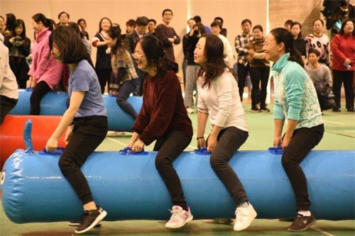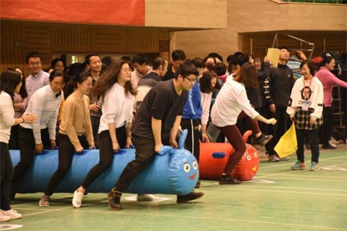 紧接着开始的比赛是毛毛虫接力,参赛老师们骑在毛毛虫状的气球上,同时发力向前蹦去,最终,社人老师们不负众望,出色地完成了比赛。