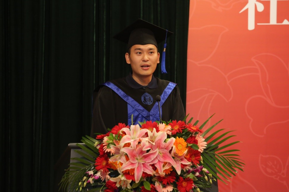 在校生代表、2016级本科生姜如璋发言。他向全体毕业生献上热烈的祝贺,并代表全体在校员工,对曾经给予师弟师妹以温暖和帮助的毕业同学们表达了衷心的感谢和深深的不舍,并祝愿大家今后能够继续散发耀眼光芒。