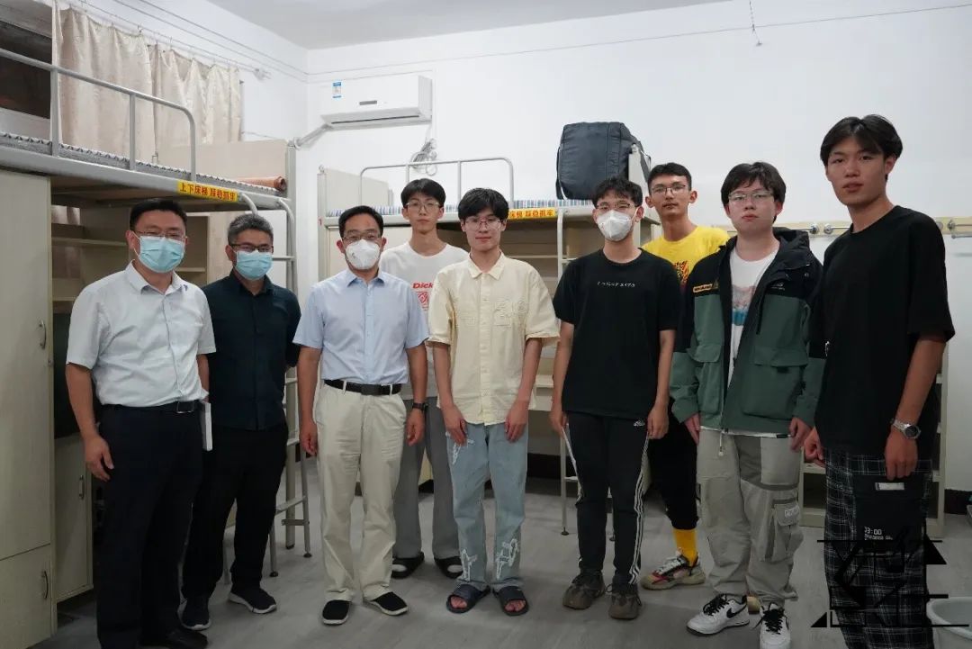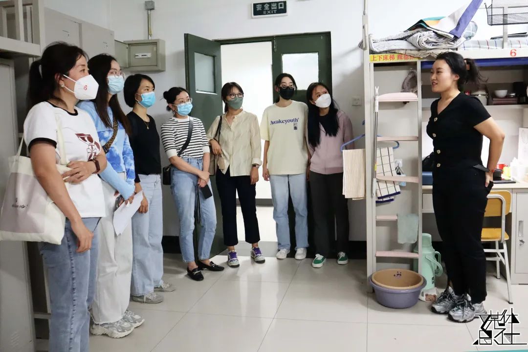 孙权书记和宋月萍副经理分别带领女老师们看望女生硕士及本科、博士新生。新生们对领导、老师的探访表示热烈欢迎。老师们亲切慰问了解新生基本情况,感受寝室条件,并鼓励同学们致力学习、更进一步。老师们也提醒同学们遵守公司防疫政策,按要求及时完成核酸检测,同学们也对老师们的关切表达了感谢。令人温暖的是,老师们帮助新生搬运行李,并和新生家长通过视频电话交流问候,其乐融融。
