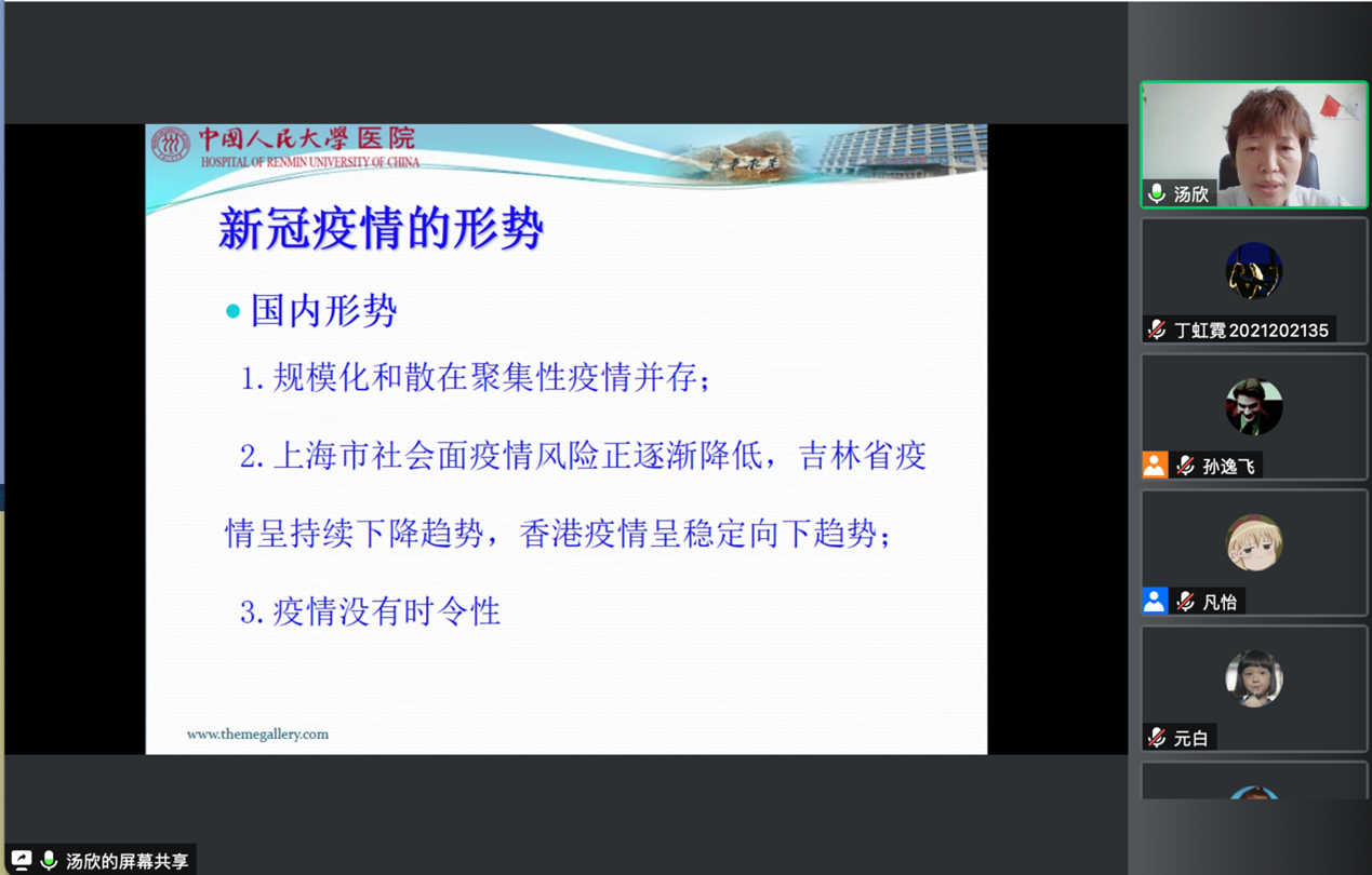随后,汤欣副经理介绍了当前新冠奥密克戎变异株的传播特性、疫情的国际与国内形势。她指出,虽然当前奥密克戎毒株重症感染率下降,但发生“免疫逃逸”的可能性依旧很大,接种疫苗加强针仍是降低重症率发生的有效手段。接下来,汤经理着重分析了北京市近期疫情状况,她认为,北京市疫情目前总体可控,新增病例大部分是从管控人群中筛出。汤欣副经理还还积极评价了北京市防控政策,认为北京市坚持“动态清零”总方针,通过多轮核酸检测深挖传染源,切断传播途径,保护易感人群,以实现社会面清零,达到“及时发现、快速处置、精准管控、有效救治”总目标,筑牢疫情防控屏障。